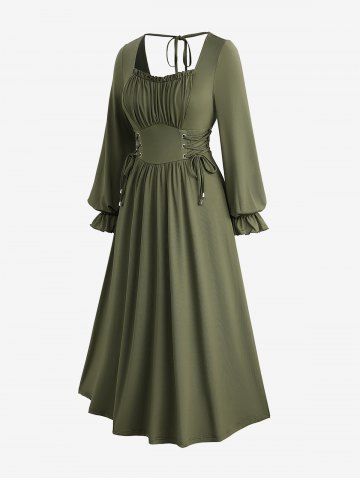 Plus Size Solid Color Lace Up Ruffles Ruched Poet Sleeves Dress - Deep Green - 1x | Us 14-16
