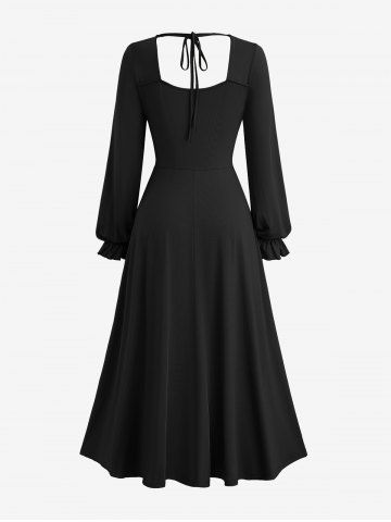 Plus Size Solid Color Lace Up Ruffles Ruched Poet Sleeves Dress - Black - 5x | Us 30-32