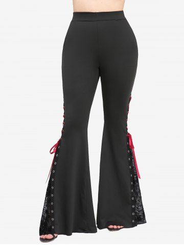 Plus Size Floral Lace Panel Flocking Lace-up Grommet Pockets Patchwork Pull On Flare Pants - Black - M | Us 10