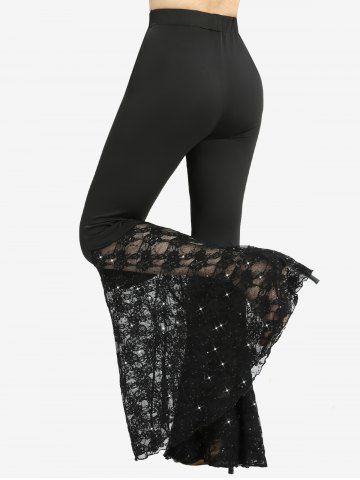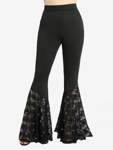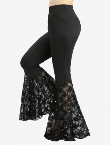 Plus Size Glitter Sequins Flower Lace Patchwork Pockets Flare Pants - Black - L | Us 12