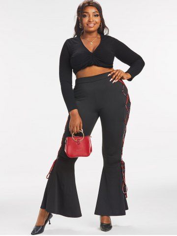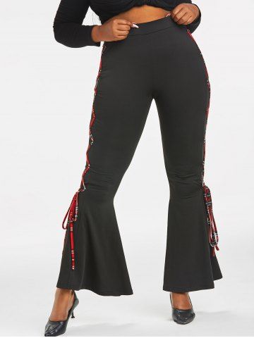 l*****t5Plus Size Lace Up High Rise Bell Bottom PantsColor: BLACK Size: 3X | US 22-24i love these trousers they are true to size and i love the color and the plaid design down the side of the trousers and came early