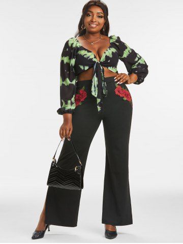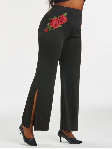 Split Hem Rose Embroidered Applique Plus Size Flare Pants - Black - 4x