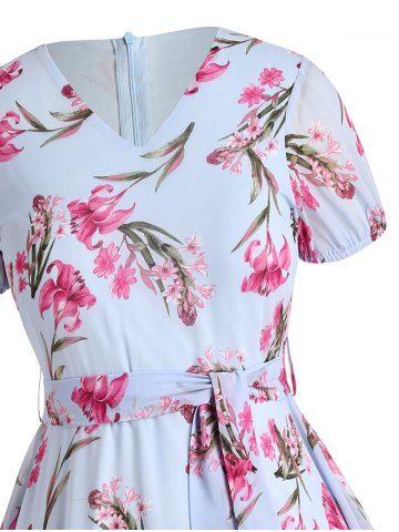 Plus Size & Curve Leaf Floral Belted Mesh Puff Sleeve A Line Midi Summer Casual Vacation Dress - Light Blue - 2x