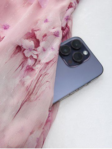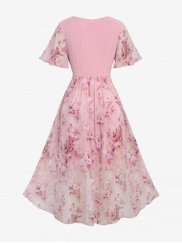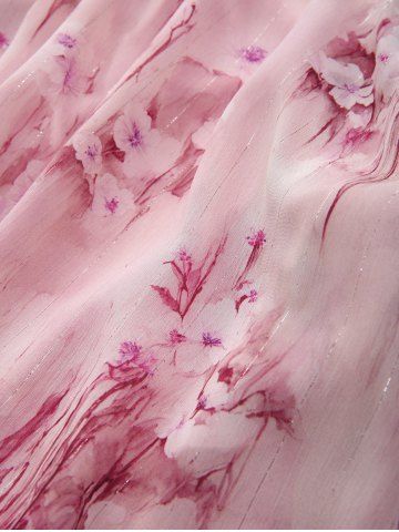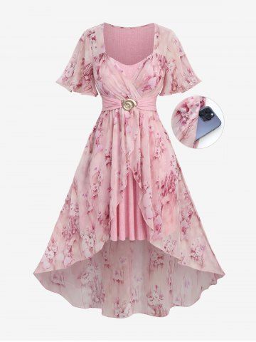 Plus Size Floral Printed Glitter Sliver Line Insert Snail Buckle Belted High Low Asymmetric 2 in 1 Pocket Dress - Light Pink - L | Us 12