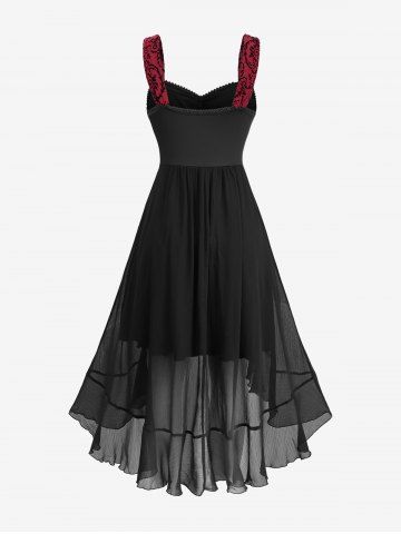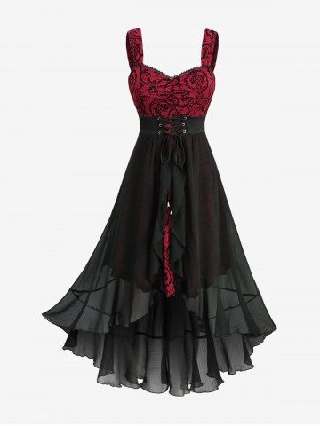 Plus Size Flowers Flocking Grommets Lace-up Lace Trim Ruffles Hem Tank Dress - Red - 1x | Us 14-16