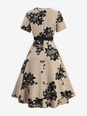 Plus Size Flowers Leaf Print Pocket Dress With Buckle Belt - Desert Color - 2x | Us 18-20
