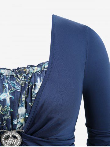 Plus Size Flowers Leaf Print Ruched Ruffles Cami Dress With Crown Buckle Crop Top - Blue - 1x | Us 14-16