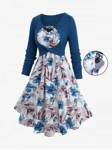 Plus Size Flowers Leaf Watercolor Print Ruffles Ruched Cami Dress With Chain Panel Hollow Out Textured Top - Blue - 3x | Us 22-24