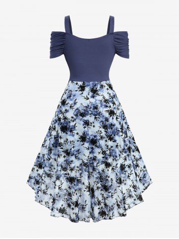 Print Dresses > Plus Size Flowers Tie Dye Print Ruched Shell Buckle Cold Shoulder High Low Tank Dress