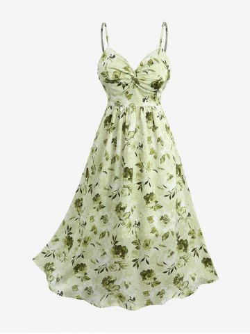 Plus Size Lace Up Ribbed Texrured Top and Flower Leaf Print Twist Cami Dress - Green - 3x | Us 22-24