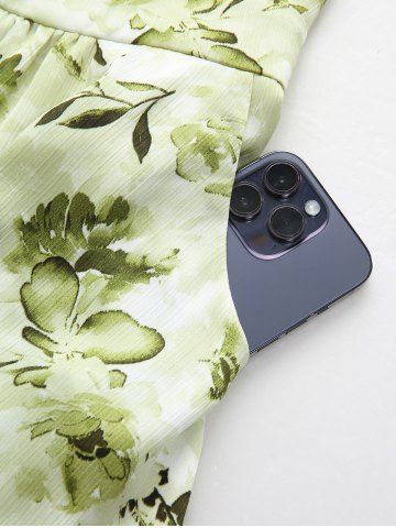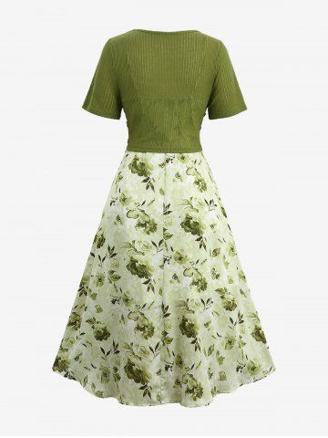 Plus Size Lace Up Ribbed Texrured Top and Flower Leaf Print Twist Cami Dress - Green - 5x | Us 30-32
