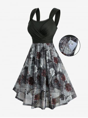 Plus Size Rose Flower Marble Print Lace Trim Ruched Tank Dress - Black - L | Us 12