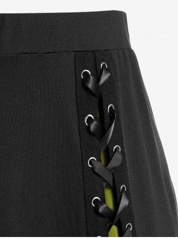 Plus Size Skulls Mesh Panel Bell Sleeves Twist Lace Up Asymmetrical 2 In 1 Top