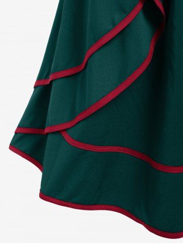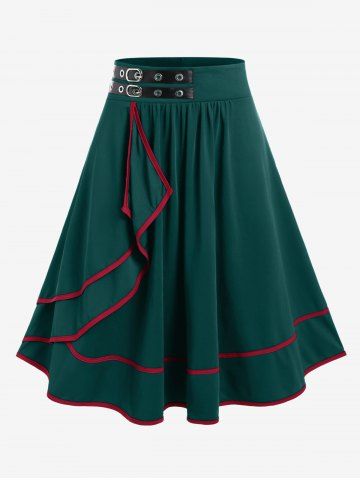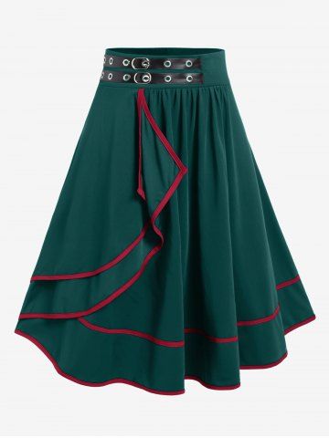 Plus Size PU Contrast Tape Grommet Buckle Ruffles Ruched Midi A Line Skirt - Deep Green - L | Us 12