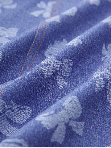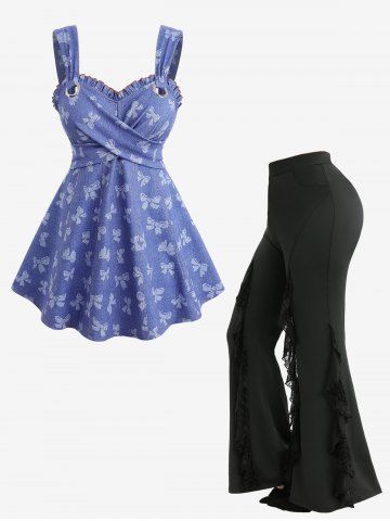 Bowknot Print Crisscross Panel Tank Top and Spider Web Flocking Lettuce Flare Pants Plus Size Outfit - Blue