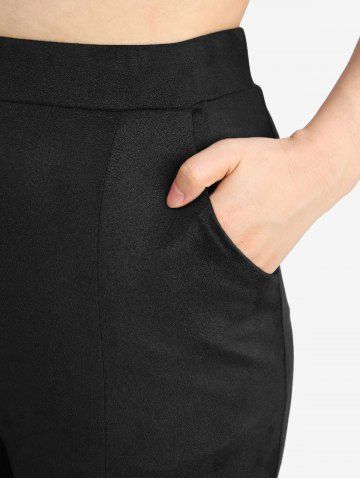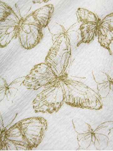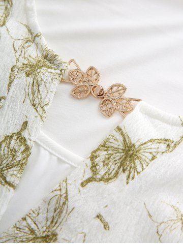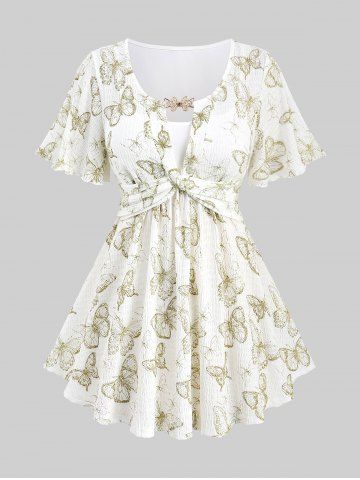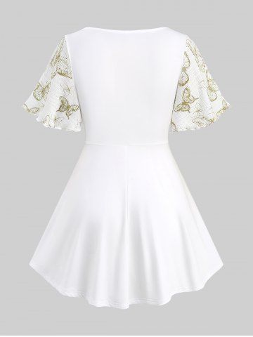 Butterfly Print Twist Top and Floral Lace Patchwork Pockets Flare Pants Plus Size Outfit - White
