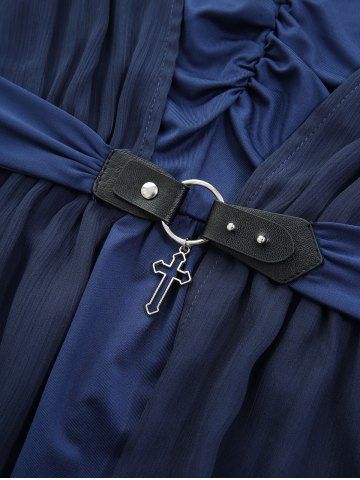 Chiffon Textured Ruched Belted Blouse and Skulls Fishnet Mesh Trim Lace Up Ruffles Flare Pants Plus Size Outfit - Deep Blue