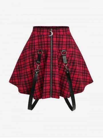 Summer Outfits > Cowl Neck Rose Lace Panel Cinched Tank Top and Plaid Print Moon Zipper Suspender Skirt Plus Size Outfit