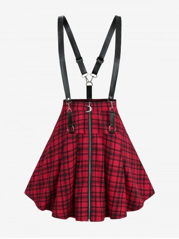 Cowl Neck Rose Lace Panel Cinched Tank Top and Plaid Print Moon Zipper Suspender Skirt Plus Size Outfit - Black
