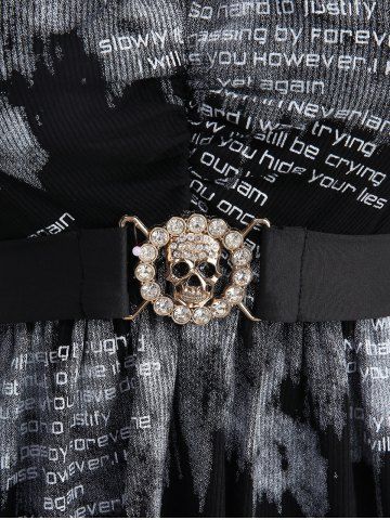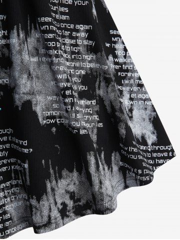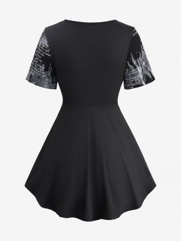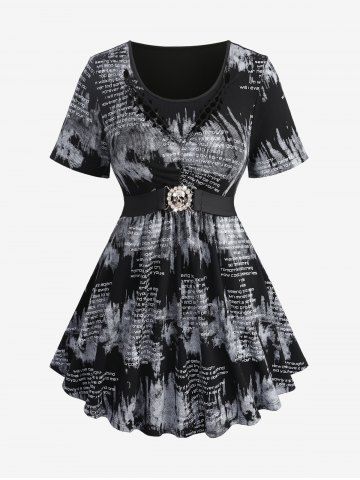 Distressed Tie Dye Newspaper Printed Top and Flocking Appliques Flare Pants Plus Size Outfit - Black