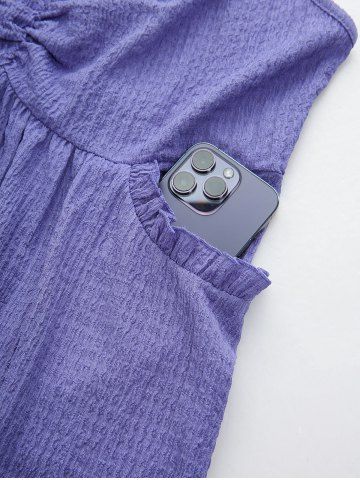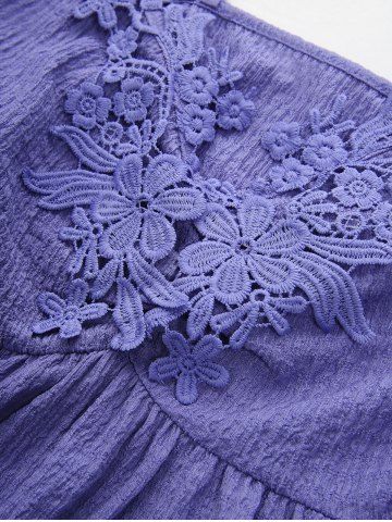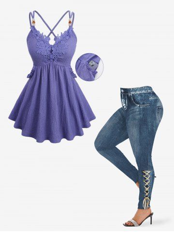 Floral Applique Textured Crisscross Top and 3D Lace Lace-up Ombre Denim Print Leggings Plus Size Outfit - Light Purple
