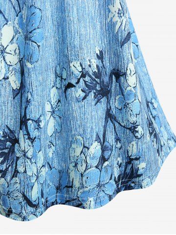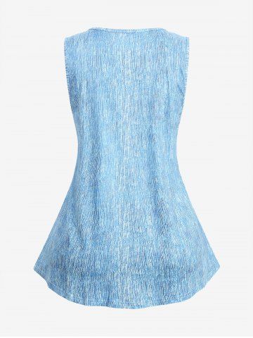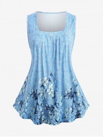 Floral Branch Print Textured Tank Top and 3D Lace Up Jean Printed Capri Leggings Plus Size Outfit - Blue