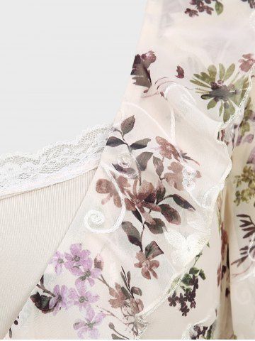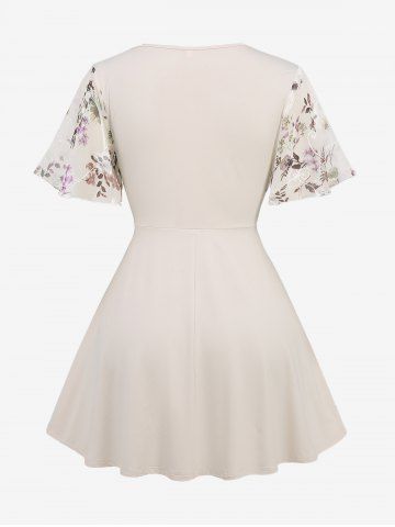 Flower Embroidered Ruffles 2 in 1 Top and Lace-up Split Pocket Solid Flare Pants Plus Size Outfit - Light Coffee