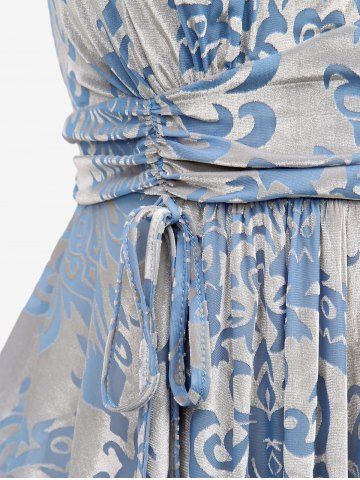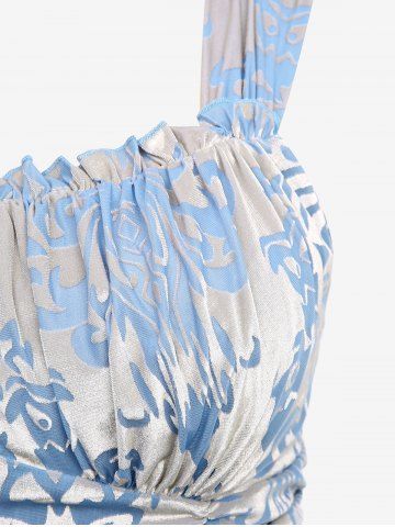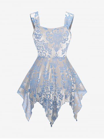 Floral Flocking Cinched Asymmetrical Tank Top and High Waisted 3D Print Leggings Plus Size Outfit - Blue