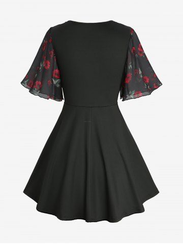 Flower Leaf Print Twist 2 in 1 Blouse and Mesh Flockinig Ribbed Pocket Flare Pants Plus Size Outfit - Black
