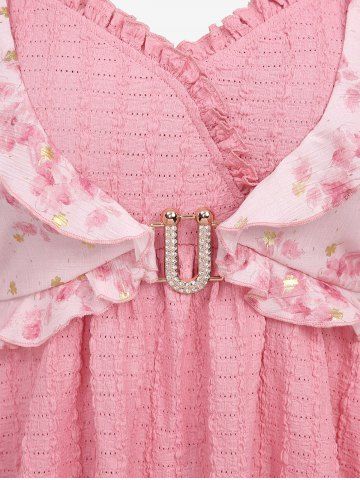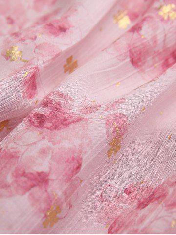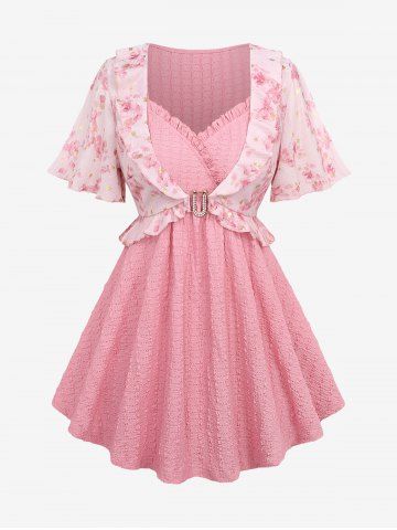 Flower Gilding Printed Ruffles Crinkle Embossed Textured Top and Pockets Drawstring Marled Wide Leg Pants Plus Size Outfit - Light Pink