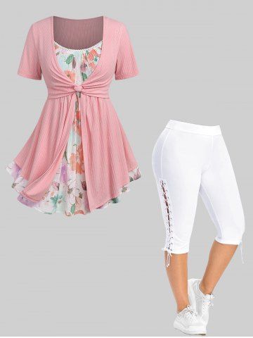 Summer Outfits > Flower Watercolor Print Twist Ribbed 2 In 1 Top and Lace Up Side Capri Pants Plus Size Outfit