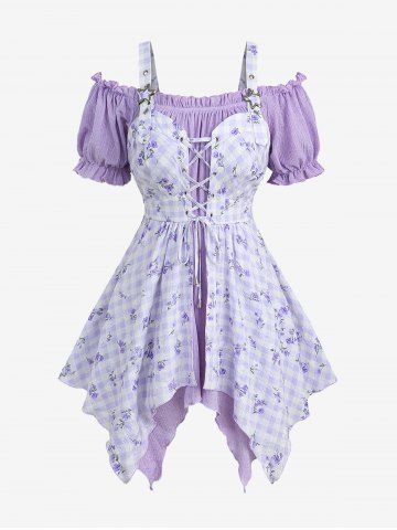 Flowers Plaid Print Lace Up Cold Shoulder Blouse and Scalloped Tassel Flare Pants Plus Size Outfit - Light Purple