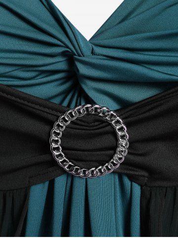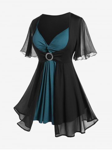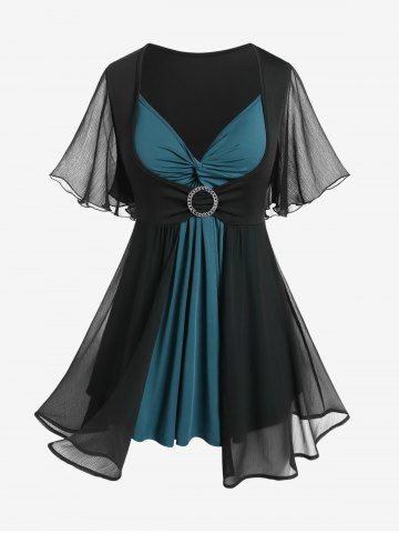 Flutter Sleeve Twist Colorblock Twofer Tee and Spider Web Flocking Lettuce Ruffles Flare Pants Plus Size Outfit - Deep Green