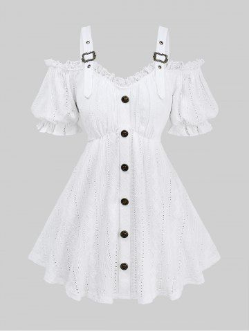 Jacquard Embroidery Pointelle Hollow Out Top and Lace Up Scalloped Asymmetric Flare Pants Plus Size Outfit - White