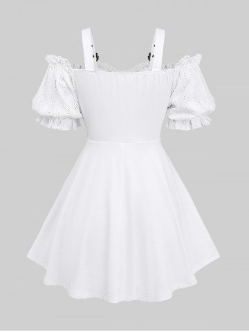 Jacquard Embroidery Pointelle Hollow Out Top and Skull Fishnet Mesh Lace Up Flare Pants Plus Size Outfit - White