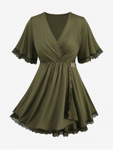 Lace Trim Surplice Asymmetrical T-shirt and Waist Ruffles Wide Leg Pants Plus Size Outfit - Green