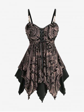 s*****45Plus Size Floral Mesh Flocking Lace Up Layered Handkerchief Cami Top(Adjustable Shoulder Strap)Color: COFFEE Size: 2X | US 18-20Very beautiful, cute style love the handkerchief hem