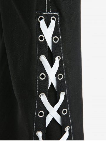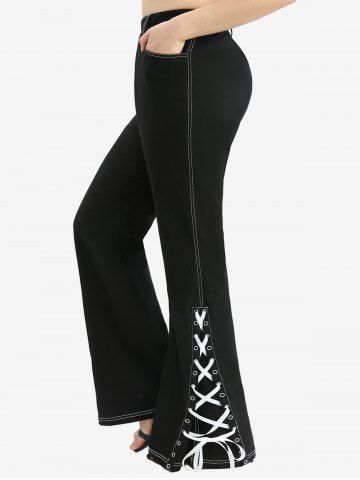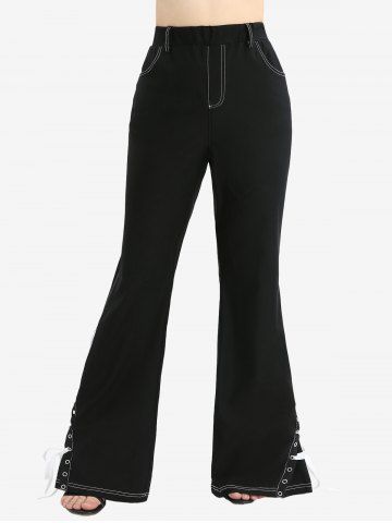 d*****r5Plus Size Split Lace Up Side Grommet Topstitching Pockets Flare PantsColor: BLACK Size: 3X | US 22-24Absolutely love these pants and was surprised at the feel of them. I took a chance on these as pants are hard to find a good fit. As someone with sensory issues these weren't omg soft, but they aren't ick either. Would buy other bottom pieces in the same fabric 100%. kind of dress pants material not swimsuit or jean.