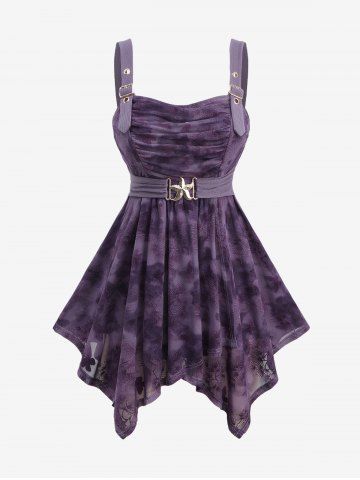 Pine Tree Butterfly Print Tank Top and Ruffles Waist Wide Leg Pants Plus Size Outfit - Purple