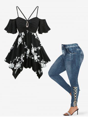 Pointelle Hollow Out Jacquard Floral Embroidered Top and Distressed Ombre Denim Print Leggings Plus Size Outfit - Black