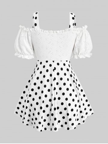 Polka Dot Print Bowknot Hollow Out Cold Shoulder 2 In 1 Top and Scalloped Tassel Flare Pants Plus Size Outfit - White