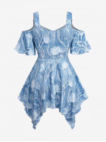 Ripped Braided Flower Print Asymmetric Ombre Top and Straps Grommet Skinny Leggings Plus Size Outfit - Blue