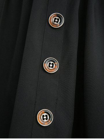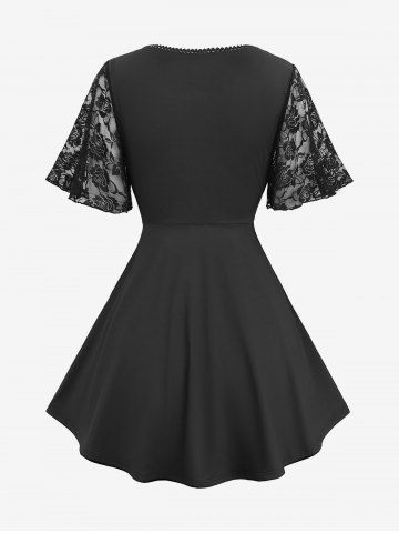 Rose Flower Lace Patchwork Lace-up Top and Mock Buttons Layered Pockets A Line Skirt Plus Size Outfit - Black
