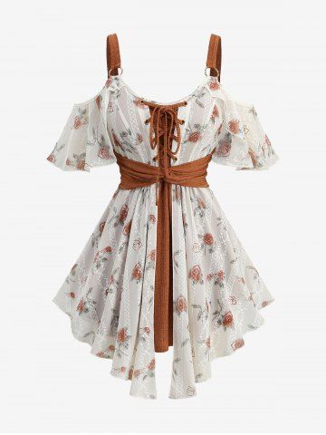 Rose Flower Print Jacquard Embroidery Blouse and Lace Up Ethnic A Line Skirt Plus Size Outfit - Coffee