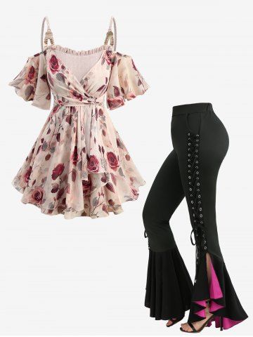 Summer Outfits > Rose Print Surplice Cold Shoulder Blouse and Lace-up Lettuce Flare Pants Plus Size Outfit