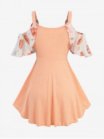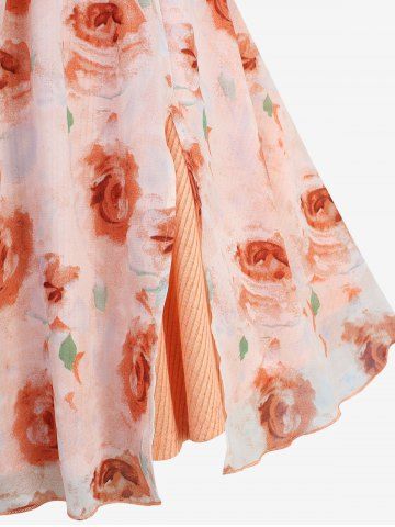 Rose Print Surplice Split Tulip Hem 2 In 1 Tank Top and Lace Up Side Capri Pants Plus Size Outfit - Orange
