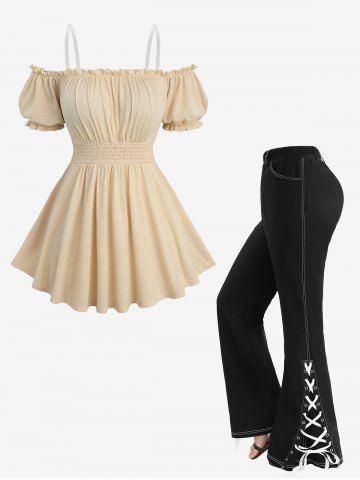 l*****t5Plus Size Split Lace Up Side Grommet Topstitching Pockets Flare PantsColor: BLACK Size: 3X | US 22-24love these trousers, perfect fit, quick delivery, love the lace bit at the bottom of the trousers