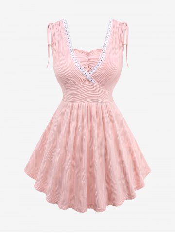 D*****n5Plus Size Ruffles Ruched Cinched Shoulder Rivet Lace Trim Ribbed Textured Tank TopColor: LIGHT PINK Size: 3X | US 22-24This shirt is true to size very stretchy very comfortable and easy to launder has not shrink and has held up well.