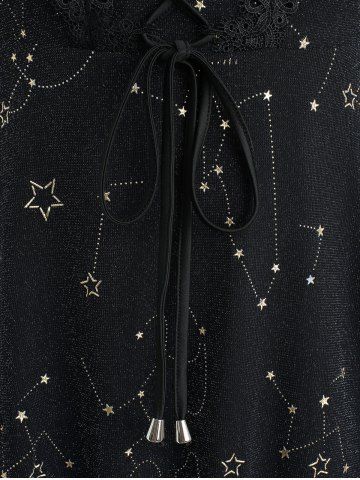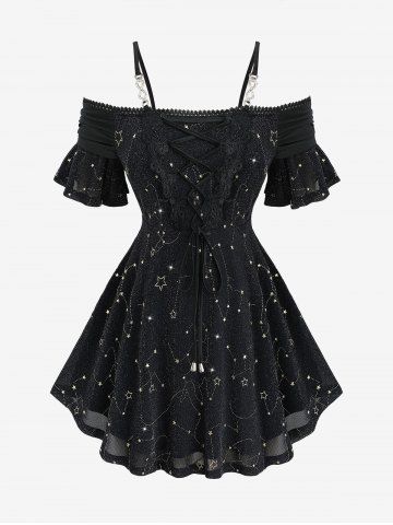 Star Stamping Lace-up Cold Shoulder Lace Trim Top and Scalloped Tassel Flare Pants Plus Size Outfit - Black