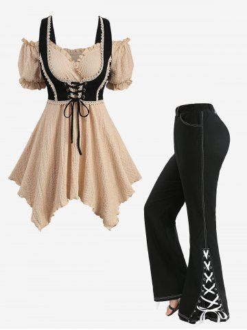 Textured Ruffles Crochet 2 in 1 Corset Top and Split Lace Up Grommet Topstitching Pockets Flare Pants Plus Size Outfit - Champagne
